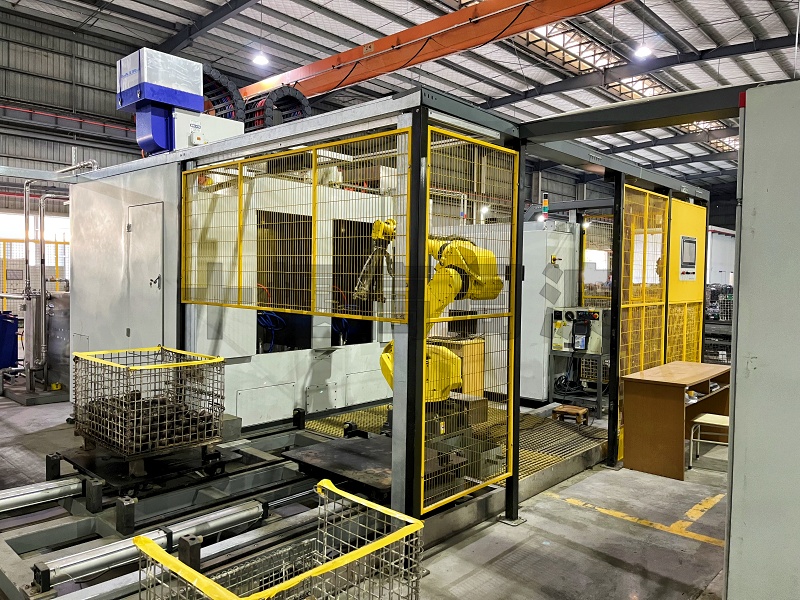 工作方式:機器人通過3D視覺無序在料框內(nèi)抓料,自動上料至淬火機床,淬火后自動下料至下料框。